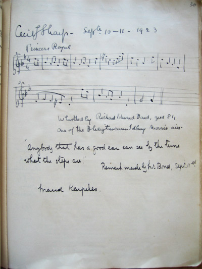 When Cecil Sharp and Maud Karpeles visited Idbury in Robertson Scott’s day, staying overnight at the manor of the 10th of September 1923, they transcribed into the Idbury Book the jig ‘Princess Royal’ as whistled by Richard Bond, then aged 81, noting it as ‘one of the Bledington-cum-Idbury morris airs’.