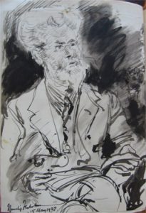 Robertson Scott wrote an account of the founding and running of The Countryman, in his book about newspaper editors he had known, ‘We’ and Me, the frontispiece to which is a photo showing Mr and Mrs Scott in their attic office; Anton van Anrooy’s original drawing of the fiddle player of the Idbury morris side, Charles Benfield – the frontispiece of the first issue of the magazine – is hanging on the wall.